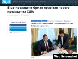 Через кілька хвилин по цьому привітання Джозефу Байдену з'явилось і на сторінці голови ОП Андрія Єрмака.
