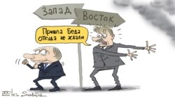 Президент Росії Володимир Путін (ліворуч) і його прессекретар Дмитро Пєсков очима російського карикатуриста Сергія Йолкіна. Раніше у Кремлі прокоментували події в Казахстані як «внутрішні проблеми».