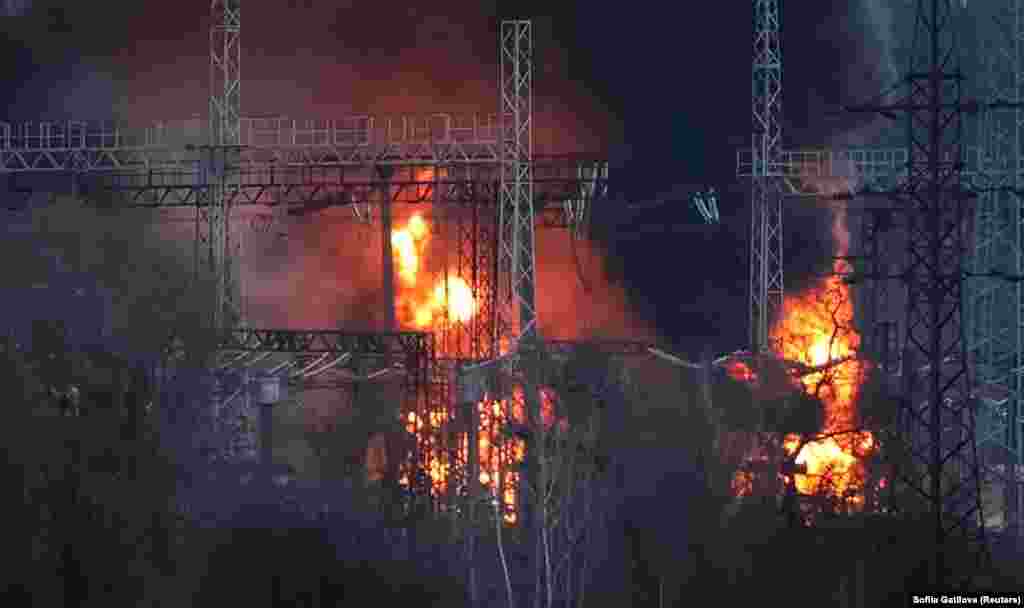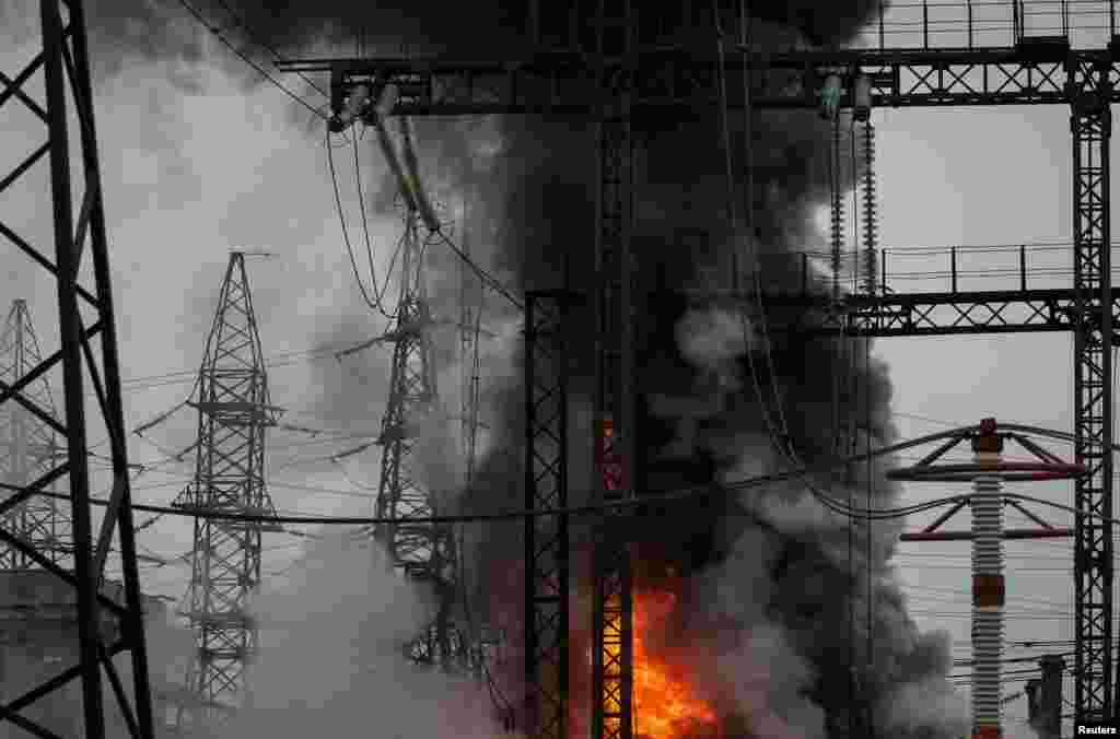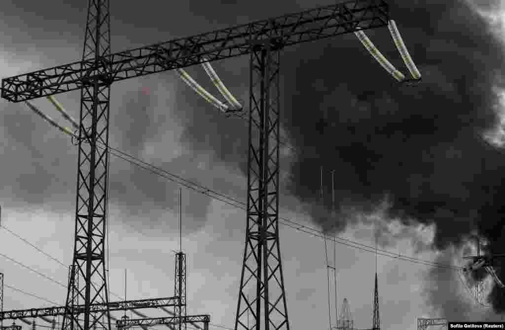 Дим здіймається в небі над високовольтною лінією електропередач на місці удару російської ракети за межами Харкова, 22 березня 2024 року