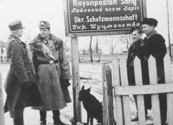 Німецькі офіцери і українські поліцаї.Основною метою допоміжної поліції є вирішення завдань, поставлених старостами для забезпечення порядку в межах старостатів, особливо по виловлюванню комуністичних і злочинних елементів...