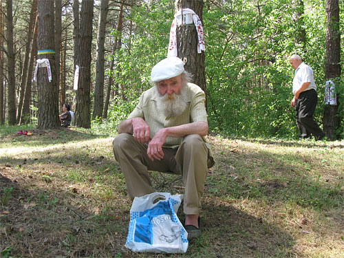 | Віталій Мацюк торік наступив на череп. Він приїжджає сюди щороку аж з Білої Церкви, що на Київщині. Йому уже за 80, він присів обабіч на землі, бо ноги вже підводять. Його мова уже дуже не зрозуміла і тиха, він весь час плаче: «Батько й сусіди тут. Кого спіймають, того й розстрілюють. Голодомор пам’ятаю. Собак їли, людей їли. Я в Києві лежав у лікарні, мені пощастило, мене не з’їли, не помер, і в лікарні не заморили». Слухати: