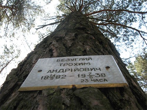 | | Скрізь по лісу на деревах висять пам''ятні дошки розстріляним у Биківнянському лісі |