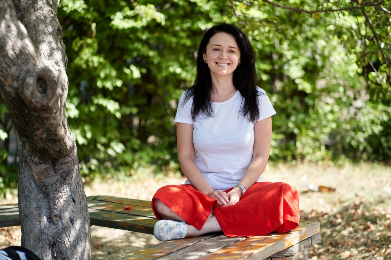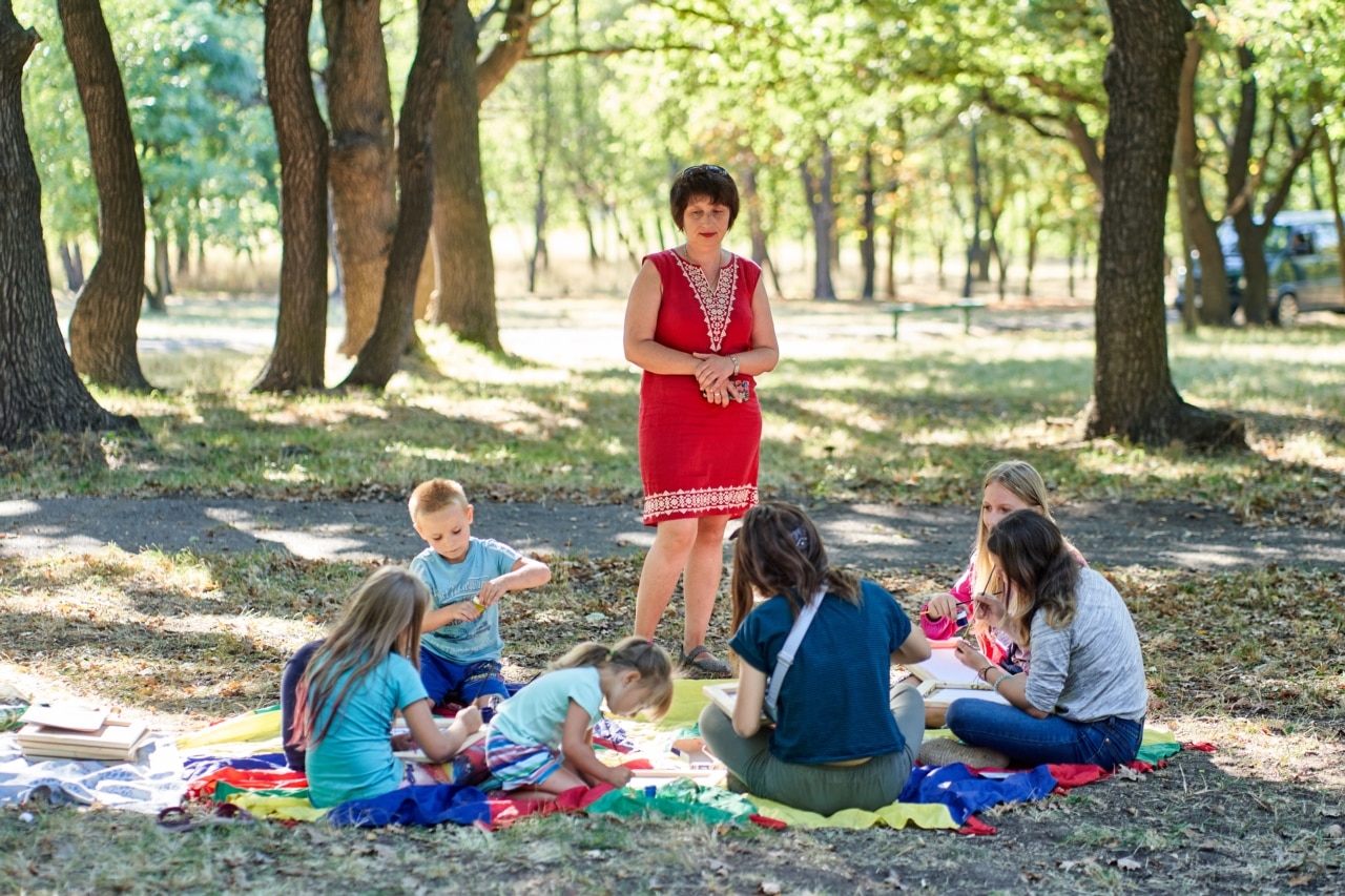 Поки говоримо з Людмилою, пледи та приладдя для малювання разом з малюками розкладає усміхнена жінка. Вона одягнена у яскраво червону довгу спідницю: поправляє неслухняні пасма волосся і говорить з дітьми, наче з дорослими. Чітко, без зменшено-лагідних слів – прохання, контакт, все злагоджено і водночас по-дружньому тепло.
