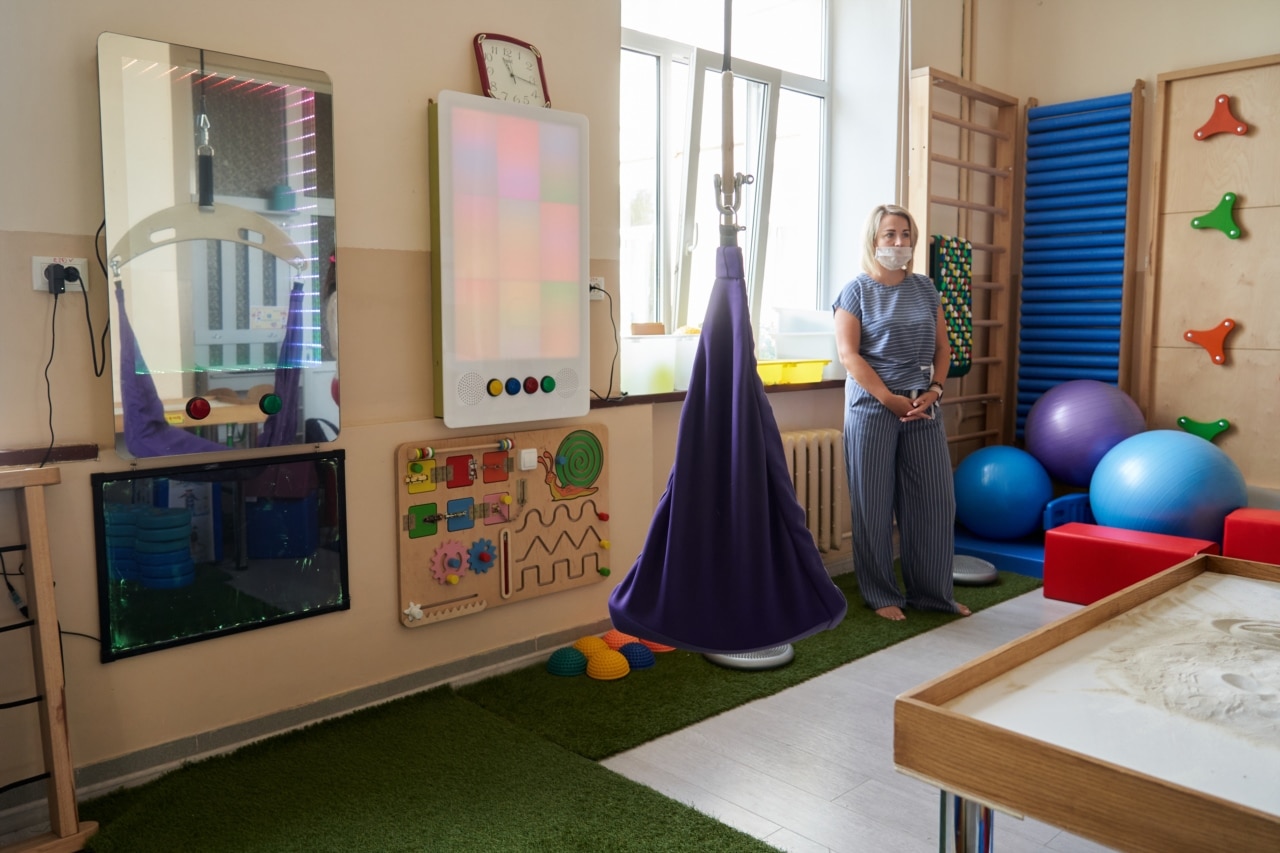 – Такі класи для інклюзивних занять, – каже вчителька-логопед, завідувачка ресурсною кімнатою Тетяна Бойкова, – насправді розкіш не тільки для нашого регіону. Щоб правильно побудувати роботу, знати, які методи і у яких випадках краще працюють, ми з колегою, заступницею директорки з навчально-виховної роботи Іриною Кур’янович, окремо одна від одної їздили на безкоштовне навчання в Ізраїль. Кімнату обладнали за рахунок пожертв, з допомогою однієї з київських шкіл та завдяки грантовим програмам. Тепер тут, зокрема, є місце для занять із логопедом та тифлопедагогом, бізіборди, які розвивають моторику, пісочна терапія, місце для фізичної реабілітації і багато іншого.