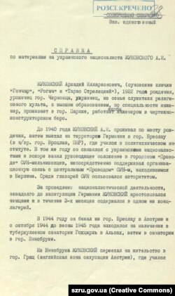 Служба зовнішньої розвідки України (СЗРУ) оприлюднила розсекречені документи про намір завербувати Аркадія Жуковського (1922–2014), українського історика, енциклопедиста, діяча Організації українських націоналістів (мельниківське крило ОУН), який проживав за кордоном. Передруковуємо публікацію відповідно до умов, обумовлених на сайті СЗРУ, та зберігши орфографію оригіналу.