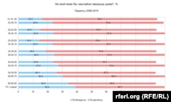 Приблизно така ж динаміка спостерігалась у відповідях про мову домашнього вжитку – у відповідях на запитання перепису «Якою мовою ви зазвичай говорите вдома?». Торік 26% назвали рідну мову білоруською, у 2009 – 23%, у 1999 – 36,7%. Що вплинуло на те, що білоруси знову повертаються до рідної мови?