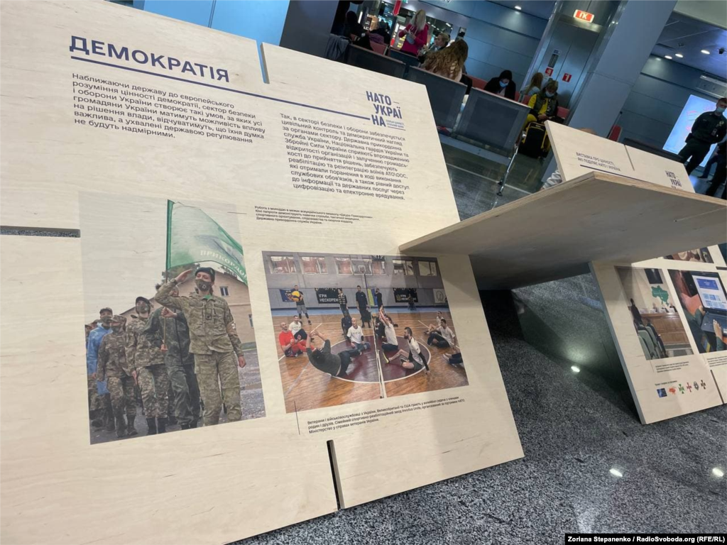 У Борисполі в терміналі Д відкрилася виставка, присвячена співпраці України й Альянсу. Відтепер усі пасажири, що очікують на свій літак у зоні вильоту, зможуть побачити унікальні знімки. На них зафіксовано, як Україна впроваджує стандарти НАТО.