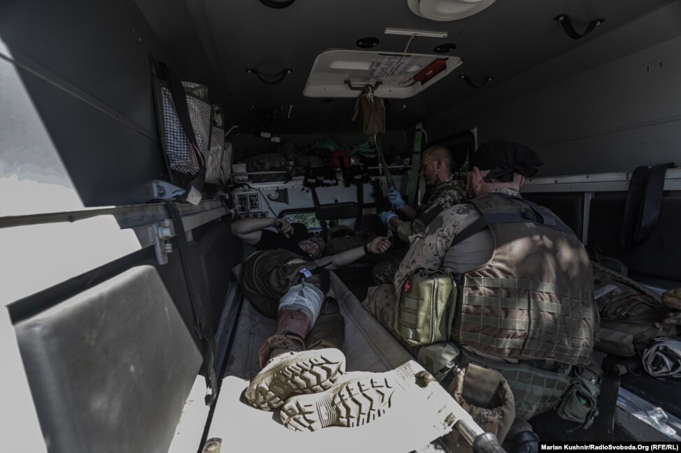Військові медики надають пораненому бійцю медичну допомогу в польових умовах в районі Світлодарська Донецької області.