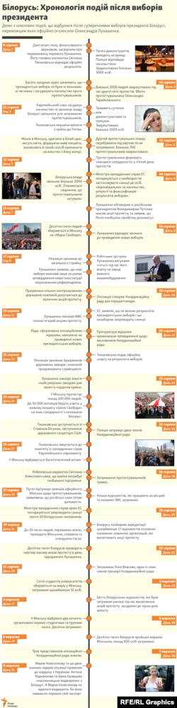 Протести в Білорусі тривають досі. За даними правозахисників, загальне число затриманих перевищило 30 тисяч осіб. Із початку виборчої кампанії порушено понад 900 кримінальних справ проти її учасників, активістів та учасників протесту і жодного – проти силовиків. Загалом за час мирних акцій, за різними даними, загинули від 4 до 7 людей.