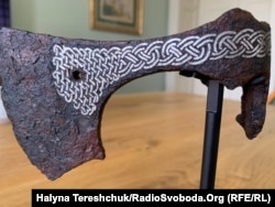 «Форма сокири збереглась. Скандинави на цей момент були язичниками, вовк їх тотемний символ. Взір добре проглядався, «чорні копачі», на щастя, не втручались у метал і не рухали візерунок, який зроблений зі срібла. Сокира інкрустована скандинавськими взорами, є чіткий символ Володимира Великого – тризуб, який він обрав і використовував як свій герб і як державний», – зауважив Тарас Хмеловський.