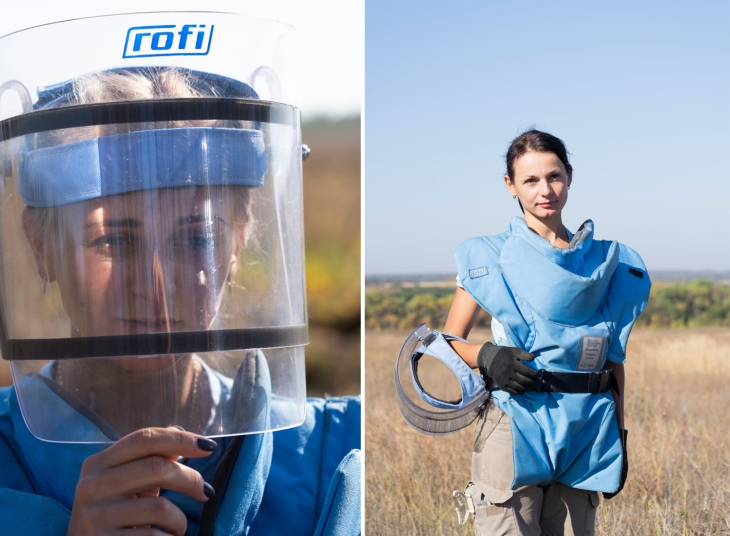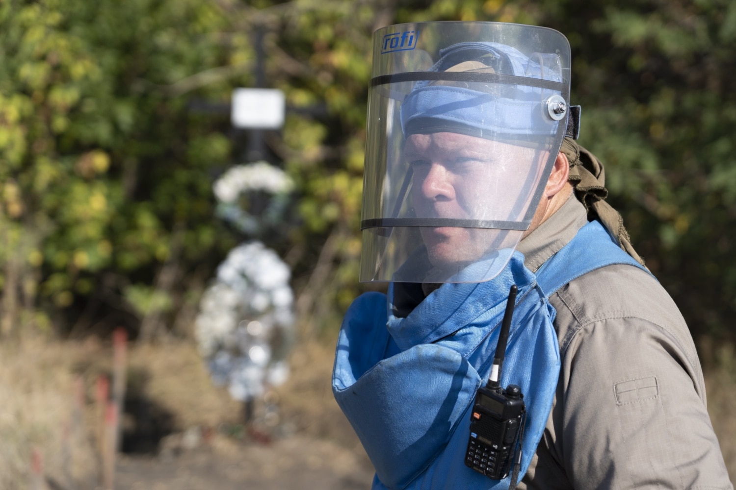 In the event of explosion, protection against fragments should be provided by a Kevlar apron and a visor – that very transparent mask on the face, consisting of two polycarbonate layers. Every deminer puts on this personal protective gear before getting to work. No piece of gear is permitted to take off before the whistle from the group leader, which announces a break.