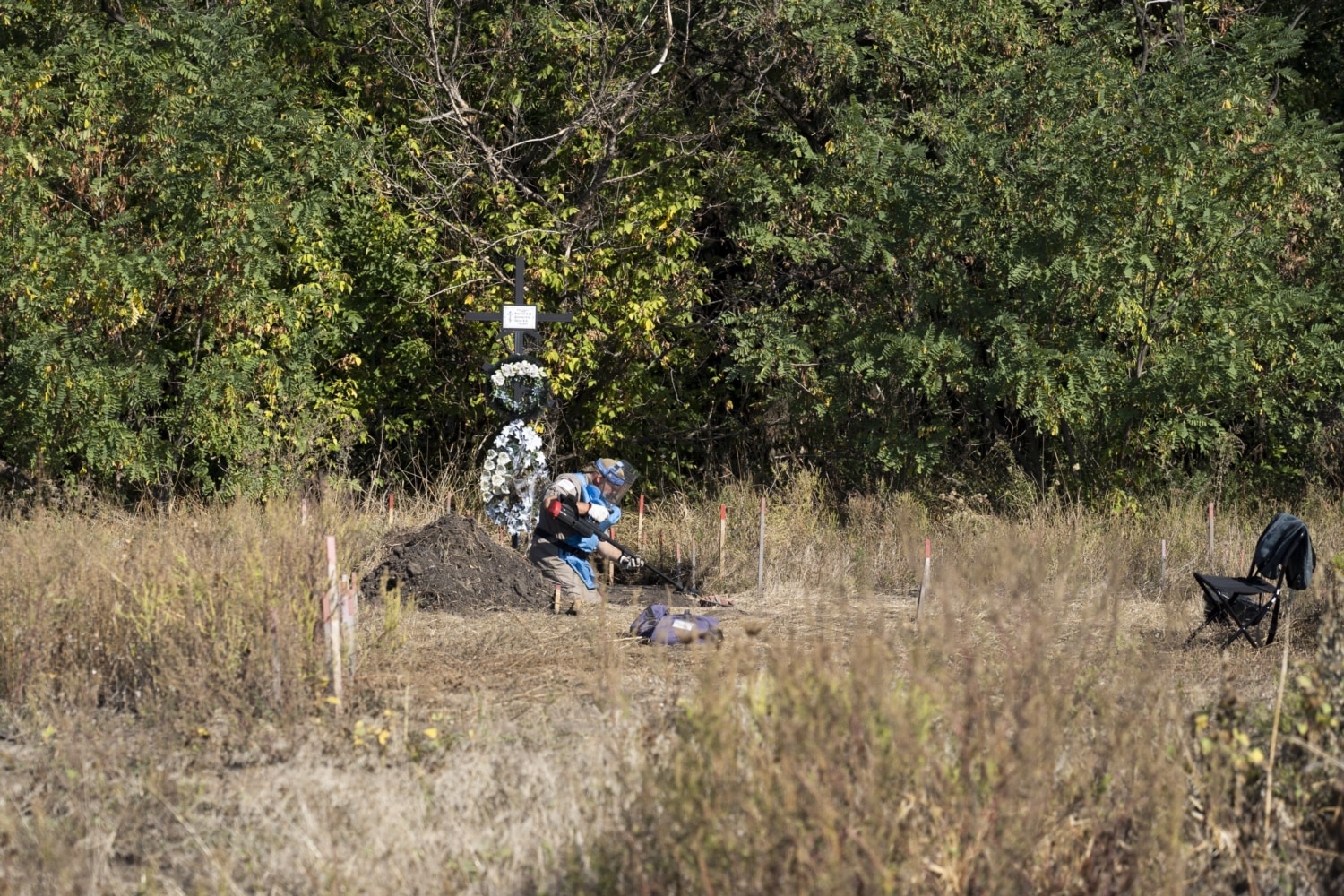 On the side of the field stands a cross with faded wreaths on it. One sapper has been working near it the whole day. It’s a difficult section, where he has been working mostly by excavation, removing one layer of soil after another and picking out fragments.