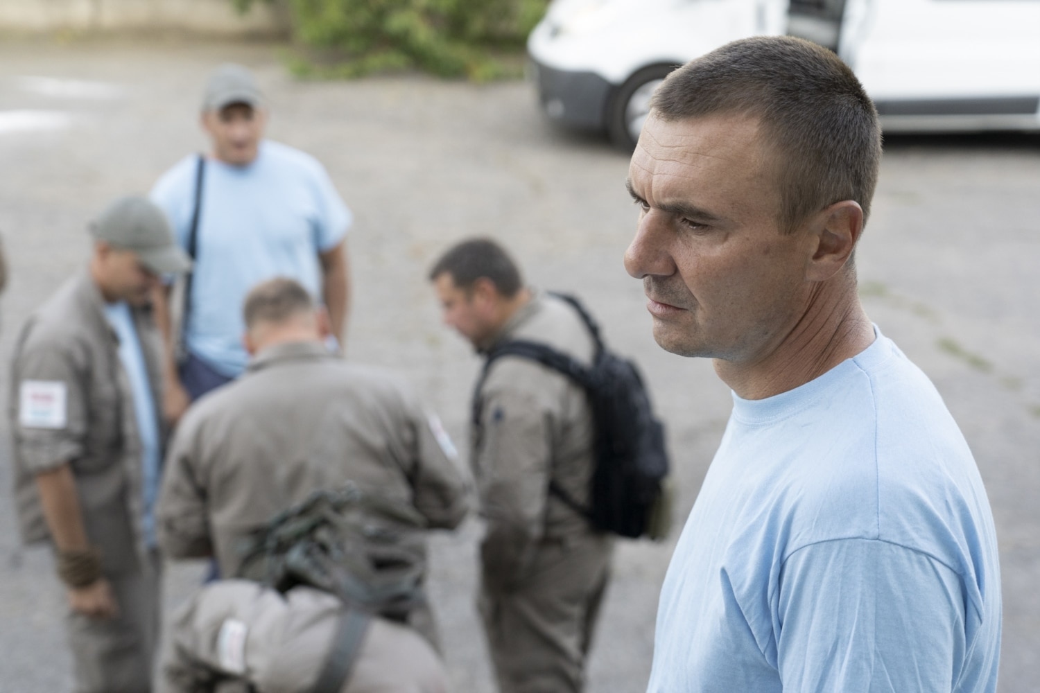 A medical vehicle must stand not more than a hundred meters away from the area where deminers work. Today, two ambulances are on duty, and so are two paramedics, Oleksandr and Yaroslav. Once in a while, the crew drives the vehicle to the hospital as if carrying a wounded deminer.