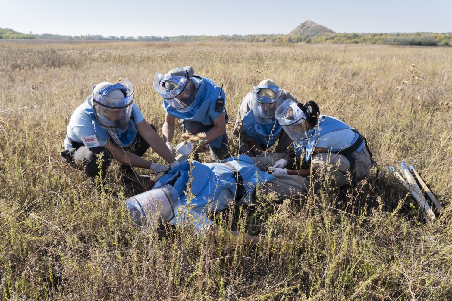 Thorns keep getting into boots, burrs stick to legs. The fragment protection visor gets in the way, constantly sliding down from the head: it’s heavy, and it doesn’t stay in place on the face when you are not used to it. Keeping fast pace, we traverse a hilly terrain, trying not to fall behind the four people carrying a stretcher and the paramedic. The team is training to evacuate a wounded deminer: the medical vehicle is waiting on a clear site, and we are walking to it on the crispy grass among different-color spikes. These spikes are strewn all over the field near the exit from Lysychansk towards Zolote, the last village before the separation line with the occupied territory. The field hadn’t seen a plow in four years; it became a steppe.