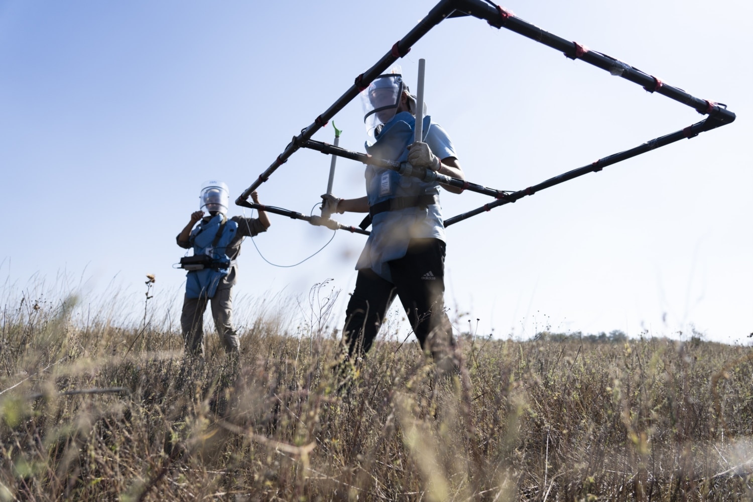 That’s how LLD looks at work. Two 100-meter ropes are stretched across the area to be cleared, leaving a one meter-wide corridor between them. A deminer walks on the cleared side, holding one part of the frame over the swept strip.