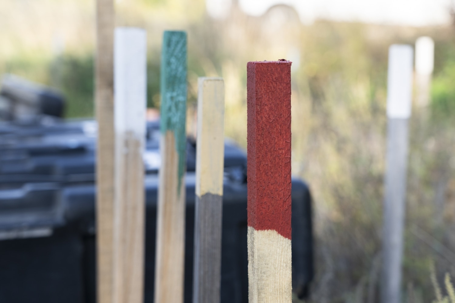 Blue, red, green, yellow, striped. The spikes stand in a row along the road. These are just samples. Out there, in the field, they stand in a strict order.