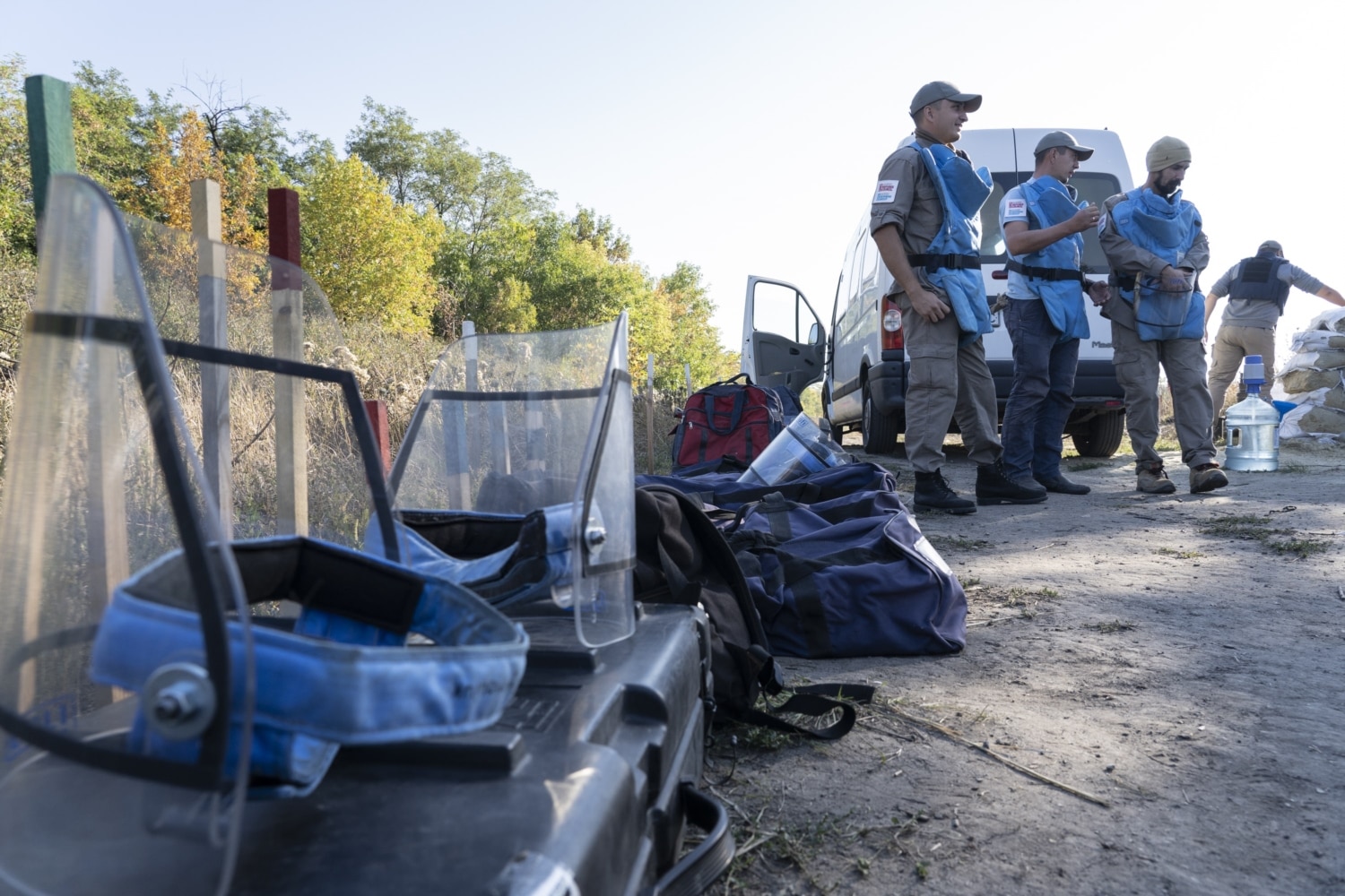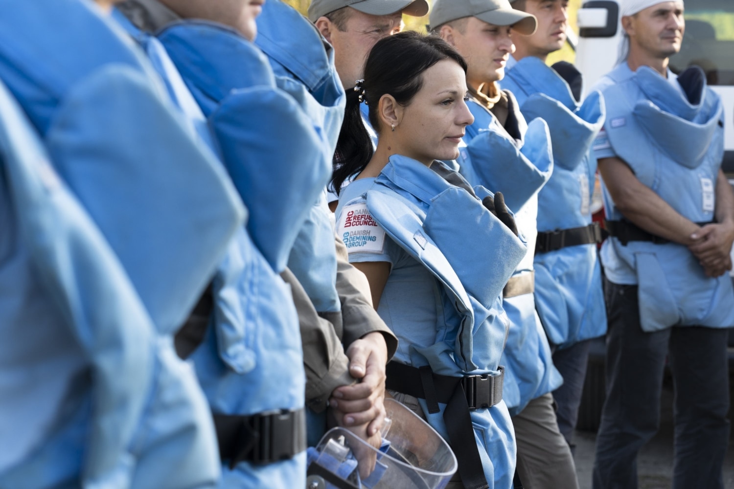 Затримати дрібні осколки від протипіхотної міни в разі вибуху мають кевларовий фартух та візор – те саме прозоре забрало на обличчі з двох шарів полікарбонату. Цей персональний захисний комплект вдягає кожен демінер перед початком роботи. Знімати будь-що можна лише тоді, коли пролунає свисток командира групи, що сповіщає про перерву.