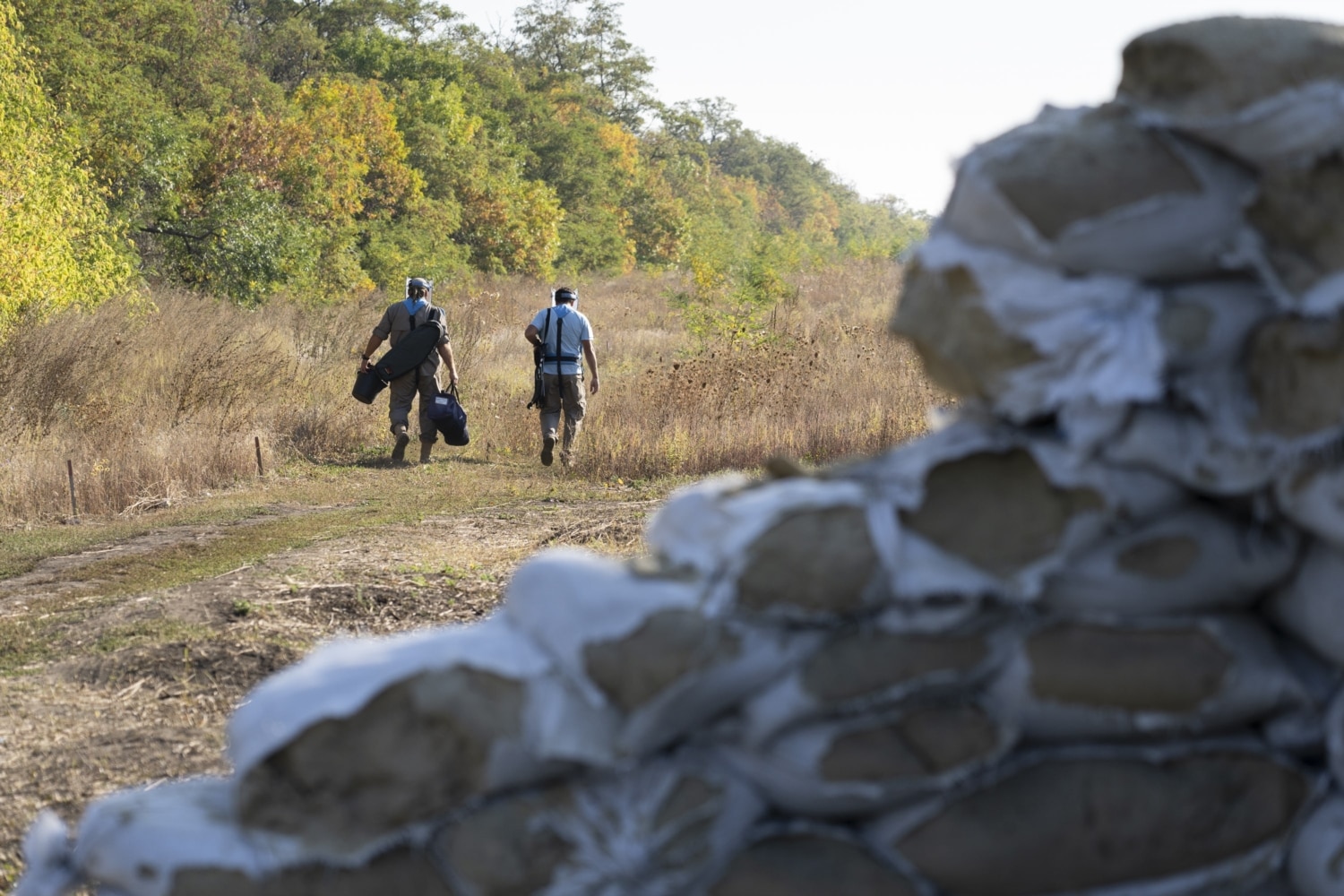 У взуття набиваються колючки, до ніг липнуть реп’яхи. Заважає, постійно сповзаючи з голови, візор – протиосколкове забрало: він важкий і не тримається на обличчі, коли не звик. Швидким кроком долаємо горбувату місцевість, намагаючись не відстати від чотирьох людей з ношами і парамедика. Команда тренується евакуювати пораненого демінера: медична машина чекає на чистій ділянці, ми йдемо до неї по хрусткій траві між різнокольорових кілків. Такими кілками розмічене все поле на виїзді з Лисичанська у бік Золотого – крайнього населеного пункту біля лінії розмежування із ОРЛО. Поле не орали вже 4 роки: воно стало степом.