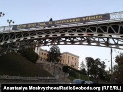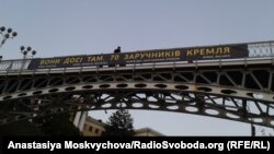 Банер висить на пішохідному мосту над алеєю Героїв Небесної Сотні у центрі Києва. Ініціатори акції – Комітет солідарності з кримськими політв’язнями.