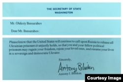 Державний секретар США Ентоні Блінкен надіслав відповідь на травневий лист-звернення до нього політичного в’язня Кремля, севастопольського журналіста Олексія Бессарабова, засудженого у сфальшованій ФСБ Росії «справі диверсантів» до 14 років колонії суворого режиму. З дозволу рідних Бессарабова Радіо Свобода публікує окремі уривки з цього листа.