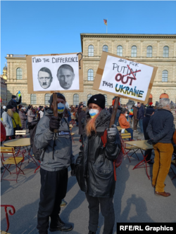 У німецькому Мюнхені 27 лютого відбулося одразу три акції протесту проти нападу Росії на Україну. Одна з них проходить у центрі міста перед Оперним театром, над яким майоріє український прапор.