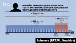 Volkswagen Touareg 2020 року випуску в грудні 2020 року з автосалону придбав тесть Соболевського Андрій Борисенко, який тоді вже був на пенсії. Вартість авта на момент купівлі – 2 мільйони гривень, на той час це було понад 70 тисяч доларів. Тесть Соболевського з 1998-го по кінець 2020 року – по дату набуття автівки – офіційно заробив 618 тисяч гривень. Та ще з 2015 року отримував пенсію, в середньому 6 тисяч гривень на місяць. Різниця між всіма доходами і вартістю автівки – майже мільйон гривень.