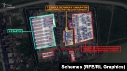 За словами військового експерта, який на прохання журналістів проаналізував знімок, крім казарм, на цій території розташований склад паливно-мастильних матеріалів. Також можна помітити близько двох сотень бойових броньованих машин різного типу та вантажних і командних автомобілів. Окремо з’явилася великогабаритна техніка, що, за словами експерта, може бути зенітними і ракетними пересувними комплексами.