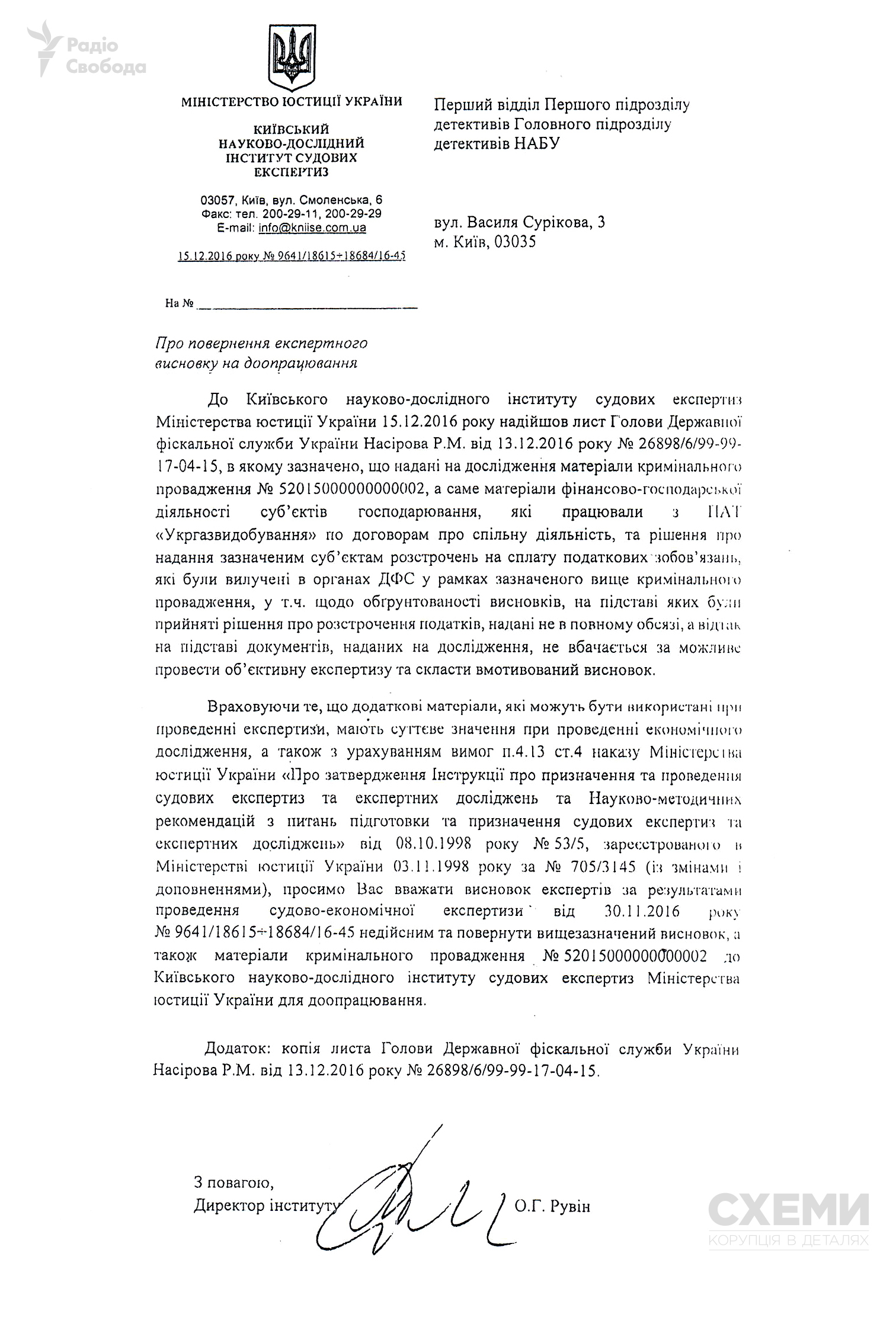 «Враховуючи те, що додаткові матеріали, які можуть бути використані при проведенні експертизи, мають суттєве значення при проведенні економічного дослідження, …просимо Вас вважати висновок експертів за результатами проведення судово-економічної експертизи недійсним та повернути вищезазначений висновок, а також матеріали кримінального провадження до Київського науково-дослідного інституту судових експертиз Міністерства юстиції України для доопрацювання», – мовиться у листі.