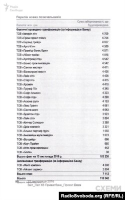 Проаналізувавши список фірм-боржників, кожна з яких винна тепер вже державному «Приватбанку» від півмільйона до майже п'яти мільярдів гривень, журналісти виявили, що ці юрособи не ведуть реальної господарської діяльності, мають у статутному капіталі в середньому не більше ніж 1000 гривень, а їхні засновники та директори – це люди, що не мають стосунку до бізнесу.