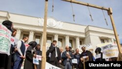 Активісти, одягнуті як «кати» із символікою парламентських фракцій, встановили під будівлею Верховної Ради шибеницю з написом «законопроект № 6220».