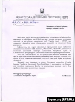 Згідно з текстом відповіді, що в прокуратуру АРК надійшов лист від Міністерства з питань тимчасово окупованих територій і внутрішньо переміщених осіб України, в якому повідомляється про «діяльності німецьких компаній в Криму». У свою чергу, прокуратура відправила інформацію для перевірки в СБУ.