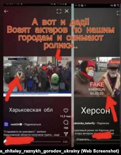Еще в начале марта медиа-проект «Петр и Мазепа» публиковал скриншоты российских видеосюжетов, которые доказывают – актеров используют для съемок пропаганды в разных городах Украины. Речь шла о съемках якобы счастливых украинцев в Херсоне и Харьковской области – герои сюжетов «мигрировали» из города в город.