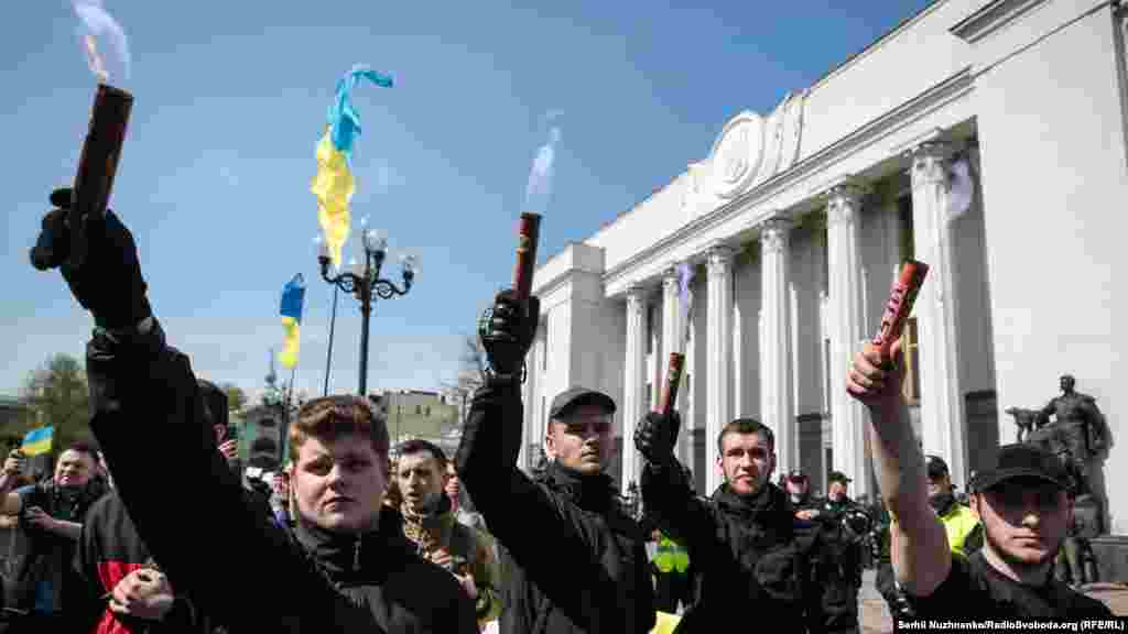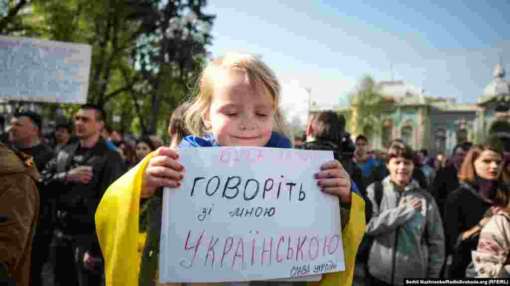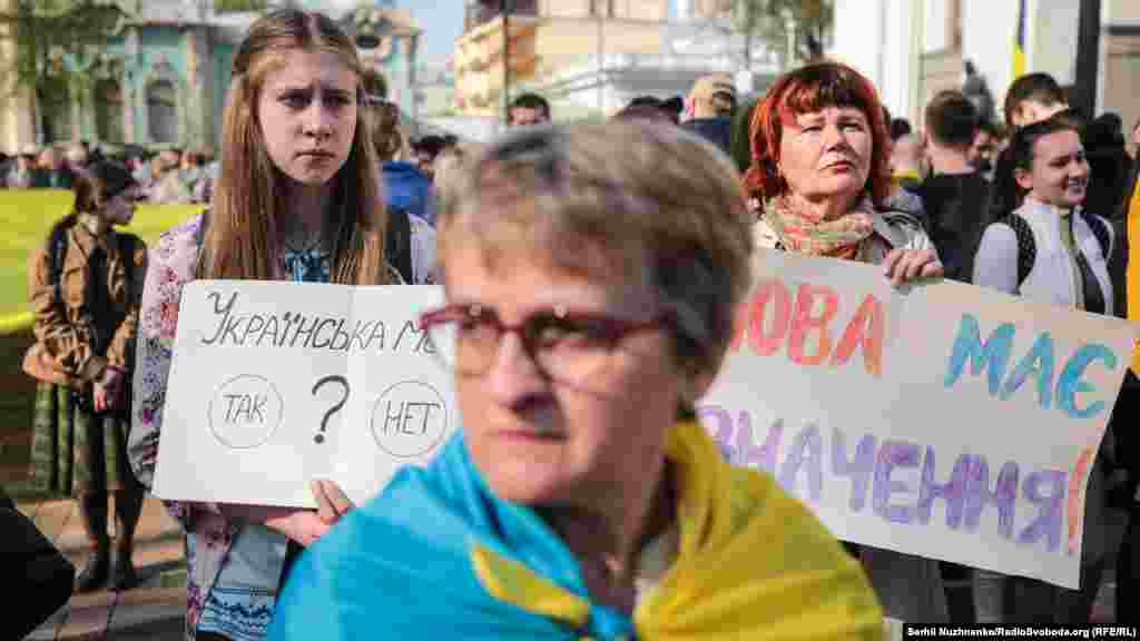 Близько тисячі людей зібралося під стінами українського парламенту, де проходила акція на підтримку закону про державну мову. Учасники тримали в руках плакати із закликами говорити українською і підтримати мовний закон.