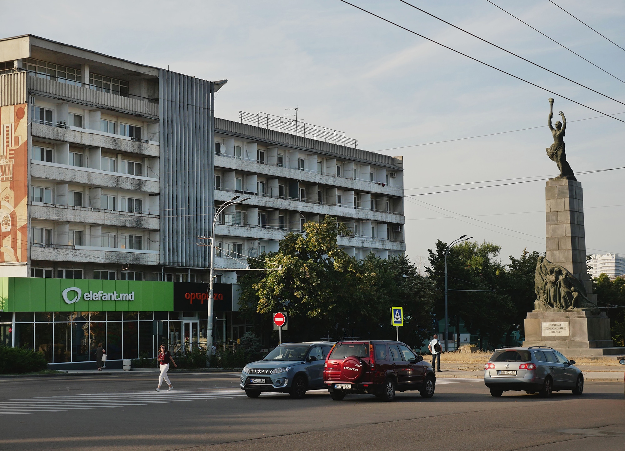 Готель «Турист» в Кишиневі і пам’ятник героям комсомолу, 1986 рік. Комсомол був політичною молодіжною організацією, пов’язаною з правлячою комуністичною партією.