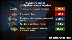 За даними The Military Balance, до повномасштабного вторгнення Росії до України у військах було до тисячі танків – більшість Т-64. У боях українська армія втратила понад 450, приблизно стільки ж Т-72 отримала від союзників, але їхніх запасів усе менше. Понад пів тисячі танків, за підрахунками проєкту Oryx, ЗСУ захопили у боях, тому танків зараз нараховується навіть більше, ніж до 24 лютого. Але дані від втрат неповні і частина техніки, у тому числі від Заходу, пішла на запчастини.