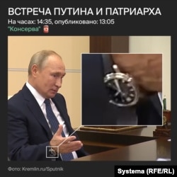 Наручний годинник Путіна під час зустрічі з патріархом йде з сильним випередженням. На ньому – 14:35. Розгледіти годинник можна на відео із зустрічі, яке опубліковано на ютуб-каналі патріархії. Хоча це й непросто: майже всю зустріч Путін тримає праву руку під столом.