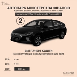 За Міністерством фінансів закріплено лише дві автівки – причому це електрокари 2019 року випуску Hyundai Ioniq EV Premium і Hyundai Ioniq EV Top. Тож у 2018–2019 роках вони взагалі не мали витрат на утримання авто – а за перші чотири місяці цього року на це пішло близько 3,5 тисяч гривень.