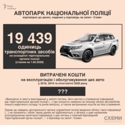 Утім, це єдина цифра, яку в Нацполіції змогли назвати журналістам. Інформацію щодо марок і років випуску автівок, а також витрачених на їхнє утримання коштів там надати не змогли – через те, що «до центрального органу управління поліції ведення обліку такої інформації не належить і облік таких даних не здійснюється». Тому за цими даними там порадили звертатися до конкретних територіальних органів поліції – бо «вони є юридичними особами і самостійно розпоряджаються майном».