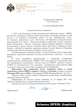 «Схеми» отримали доступ до листа Мединського, адресованого гендиректору «Росія-1». Очільника російського державного мовника він запрошує долучитися до розробки архітектурних об’єктів «монументальної пропаганди».