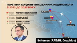 Після початку повномасштабного вторгнення Росії в Україну, згідно з отриманими даними про перетин кордону Мединського, він відвідував окупований Луганськ, а також – Дубай та Ташкент.