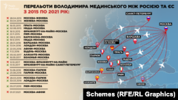 У вересні 2014 року, наприклад, він разом із дружиною відвідав Венеційський кінофестиваль. Наступного року, згідно з даними витоку пасажирів авіарейсів, які отримали «Схеми», Мединський був у Франції, Чехії, Швейцарії та Іспанії. У 2016-му – в Австрії та Греції, а у 2017-му – в Німеччині та Італії. Наступного року – знову Франція. У 2019-му – Франція, Іспанія, Італія, а у 2021-му – Греція.