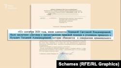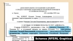 Є інший документ – угода Новицької з обвинуваченою Кузьміч. Тут згадка, що адвокатку запросила Лідія Дьяченко – перша секретарка російського посольства в Україні, представниця «Россотрудничества».