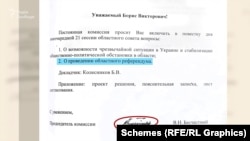 Серед архівних документів «Схеми» розшукали список з прізвищами депутатів Донецької облради, які ініціювали розгляд питання про референдум. Пізніше – невідомо, коли саме – у документі закреслили слово «республіка» і замінили на «суб’єкт».