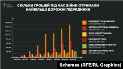 Наприклад, після початку вторгнення головний підрядник Дніпропетровської ОВА здійснив дві великі закупівлі – загально близько 2 тисяч тонн щебеню, який використовується у будівництві та ремонті доріг. В одному випадку «Будінвест» заплатив фірмі «Максі-буд плюс» 1258 гривень за тонну, в іншому ще більше – 1466 гривень за тонну. Втім аналіз журналістів виявив, що в цей же період «Максі-буд плюс» купувала саме такий тип щебеню у виробників щонайменше у 6 разів дешевше – за 185 та 233 гривні за тонну. Тобто, виходить, «Максі-буд плюс» перепродала щебень «Будінвесту» за ціною, завищеною у декілька разів, і це, очевидно мало вплив на кінцеву вартість контракту для держави.