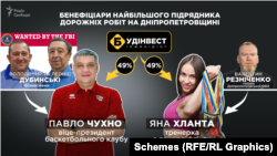 Таким чином, професійна спортсменка Яна Хланта, та баскетбольний функціонер Павло Чухно, на яких порівну оформлені частки фірми «Будінвест Інжиніринг», схоже, напряму пов’язані з головою ОДА Валентином Резніченком, та розшукуваними бізнесменами братами Дубинськими.