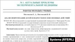 У розпорядженні журналістів-розслідувачів «Системи» опинилася збірка наукових праць молодих дослідників із російського Волгоградського медичного університету. Рік тому молоді вчені Мостовська О.А. та Мостовський В.В. під керівництвом дитячого невролога Мостовської Ю.В. проводили анкетування дітей в окупованій Станиці Луганській, яка розташована на сході Луганської області України і ось уже понад десять років перебуває в зоні безпосередніх бойових дій.