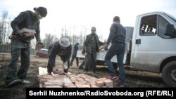 Поки спілкуємося із Віталієм, з-за наших спин виїжджають іще дві автівки. Без зайвих розмов чоловіки беруться усе вивантажувати й розкладати біля тієї ж вцілілої хати.