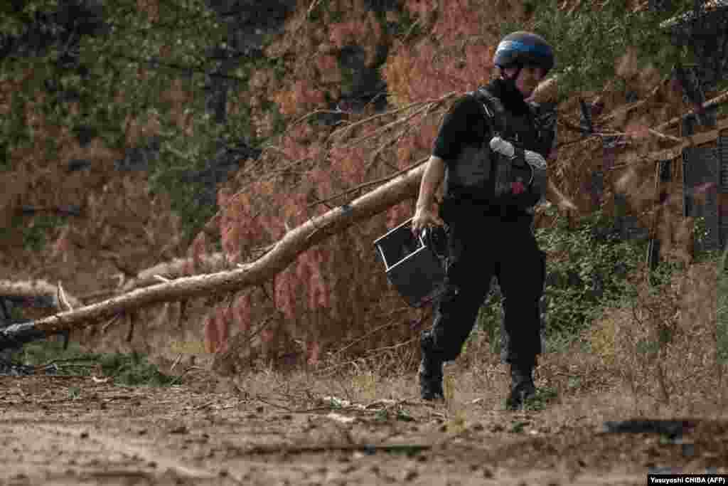 Піротехнік ДСНС України готується до знешкодження мін та інших вибухових речовини в районі нещодавно звільненого міста Лиману.