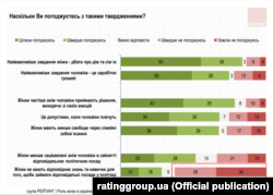 За даними опитування, проведеного соціологічною групою «Рейтинг» , 83% українців вважають, що найважливіше завдання для жінки у суспільстві – це дбати про дім і сім’ֹю. А 75% респондентів переконані, що основна функція чоловіків полягає у зароблянні грошей.