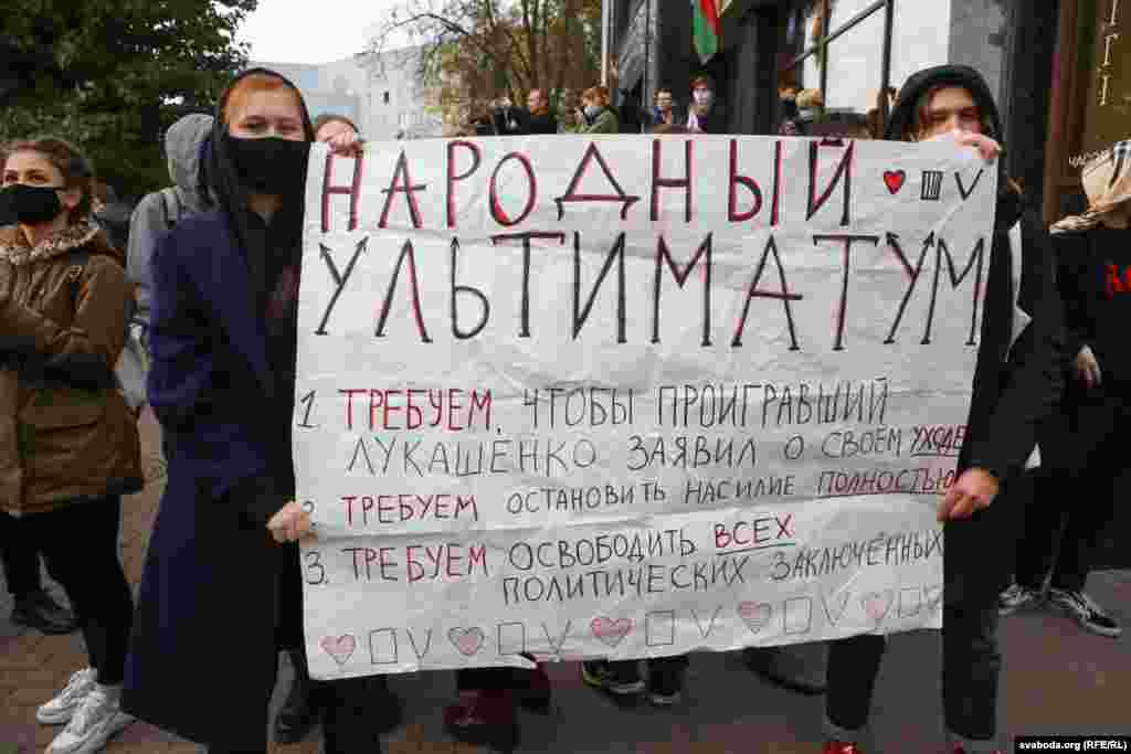 13 жовтня Світлана Тихановська заявила, що учасники акцій протесту оголошують Олександрові Лукашенку «народний ультиматум»: до 25 жовтня він повинен піти у відставку. У разі невиконання вимог з 26 жовтня, за словами Тихановської, розпочнеться загальнонаціональний страйк.